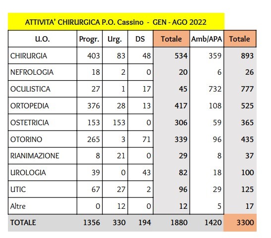 Dalla lettura dei dati aggiornati del PO Santa Scolastica di Cassino, relativi all’attività chirurgica, emerge un incremento rilevante di quella svolta all’interno della UOC di Chirurgia Generale, ed il trend è positivo per tutti gli altri reparti.