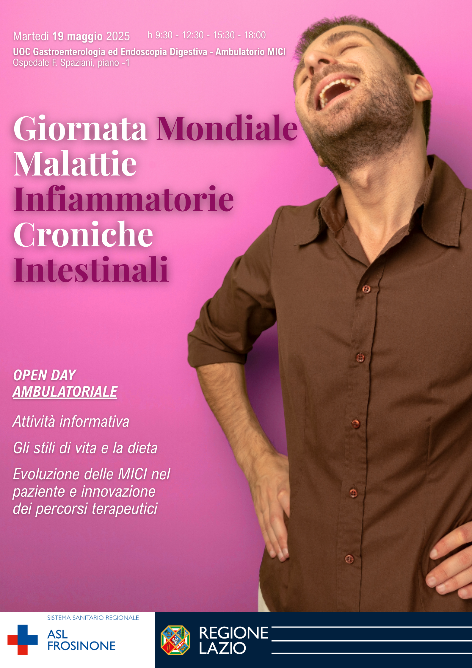 In occasione della Giornata Mondiale delle Malattie Infiammatorie Croniche Intestinali (MICI), la ASL di Frosinone organizza un Open Day informativo presso l’Ospedale “Fabrizio Spaziani” di Frosinone, in programma per lunedi 19 maggio, con orario 9:30 – 12:30 e 15:30 – 18:00.