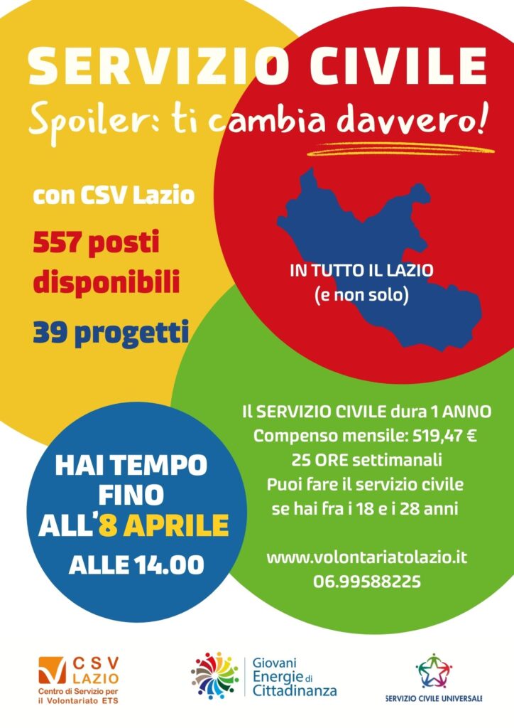 Le Domande scadono il prossimo 8 aprile 2026 e si devono fare esclusivamente on line sul Portale www.volontariatolazio.it