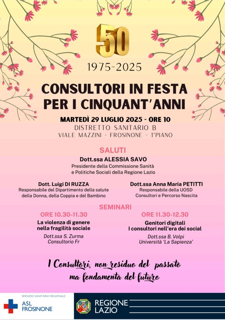 In occasione del 50° anno dell’istituzione dei consultori , la Uosd Consultori e Percorso Nascita, afferente al Dipartimento della Salute della donna, del bambino e dell’età evolutiva, ha organizzato un evento che si terrà martedì 29 luglio, a partire dalle ore 10, presso il Consultorio di Frosinone, ubicato nel Distretto sanitario B di viale Mazzini. La data coincide con il giorno in cui, 50 anni fa, è stata varata la legge 405/75 che ha istituito i consultori a livello nazionale.