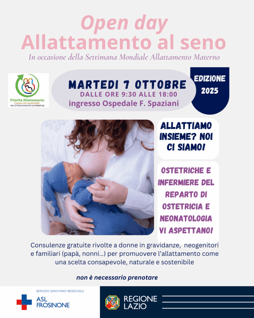 Per aderire non è necessaria una prenotazione: basta raggiungere martedì 7 ottobre l’Ospedale “Spaziani”. L’iniziativa rientra all’interno della Settimana Mondiale dell’allattamento materno promossa da WABA (World Alliance for Breastfeeding Action), con il patrocinio di UNICEF, OMS e Ministero della Salute.