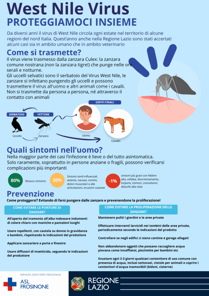 A seguito della presenza di infezioni da virus West Nile sia in soggetti umani che in animali sul territorio della provincia di Frosinone è utile ricordare quanto segue:
