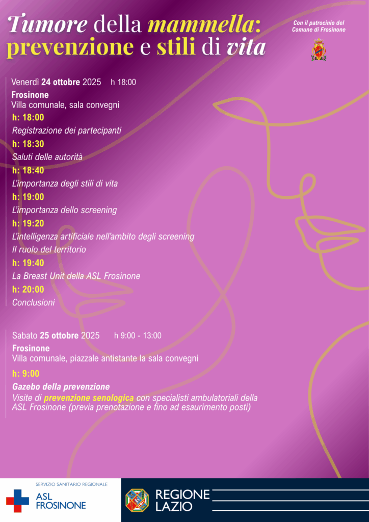 Nella prima giornata, dalle ore 18:00 alle 20:00 nella Sala convegni della Villa comunale si terrà l’incontro “Tumore della mammella: prevenzione e stili di vita”, un momento di confronto e sensibilizzazione aperto alla cittadinanza. Si parlerà dell’importanza degli stili di vita, dello screening, del ruolo del territorio e della Breast Unit della ASL di Frosinone.