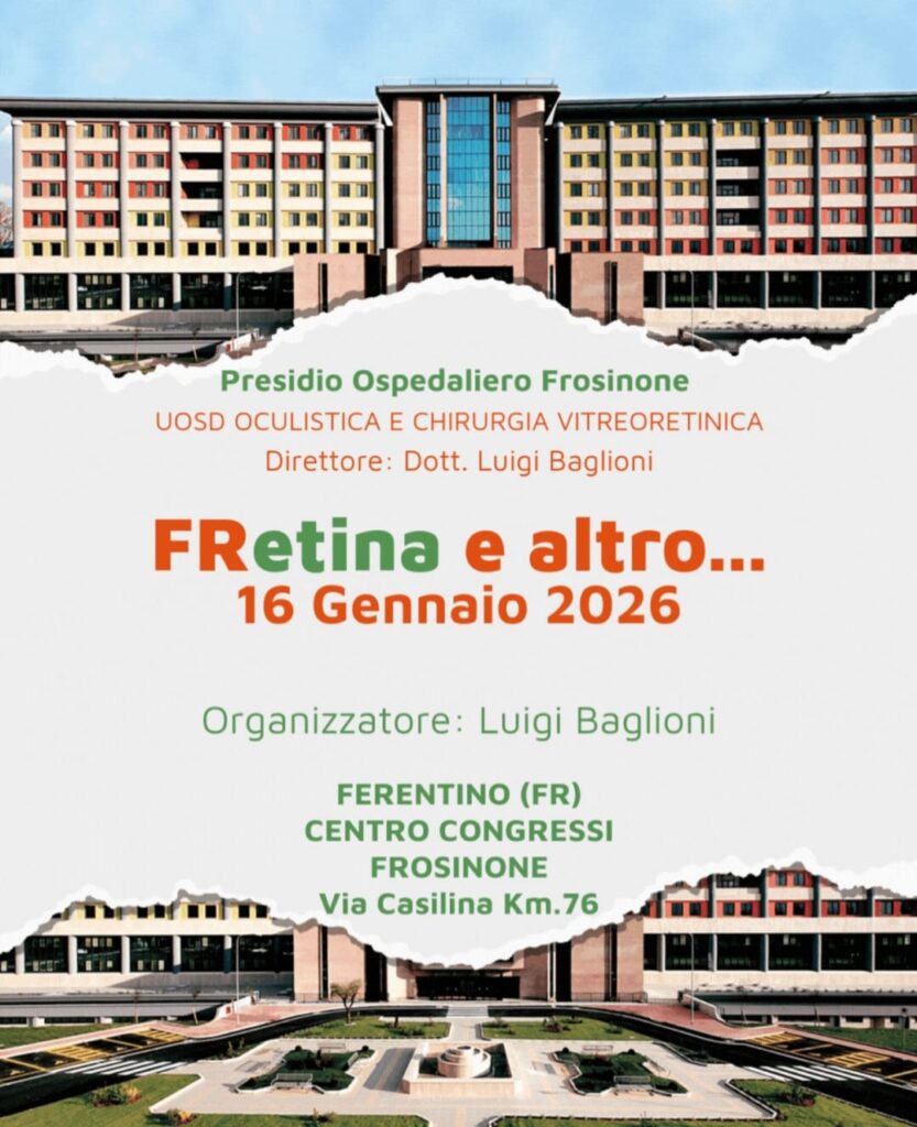 Venerdì 16 gennaio, a partire dalle ore 8:30, si terrà a Ferentino una nuova edizione del convegno “FRetina e altro…”, appuntamento scientifico di rilievo dedicato all’aggiornamento professionale in oftalmologia, con un focus specifico sulle patologie retiniche e sulla chirurgia vitreoretinica.