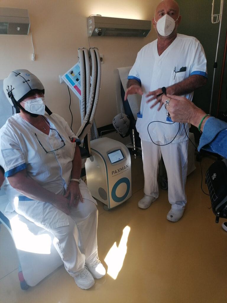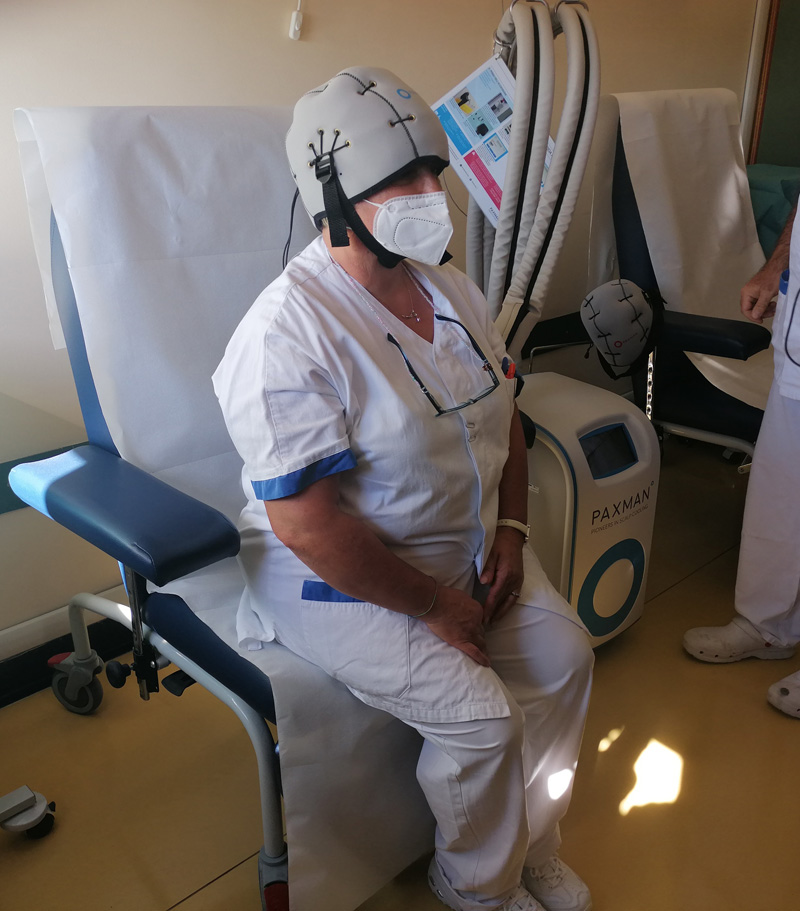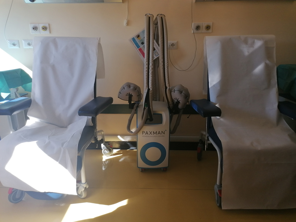 Os pacientes serão recebidos em uma sala dedicada com duas poltronas: o capacete de resfriamento é ligado meiahora antes do início da terapia, usado durante toda a duração do tratamento e durante os noventa minutos após o término do mesmo.