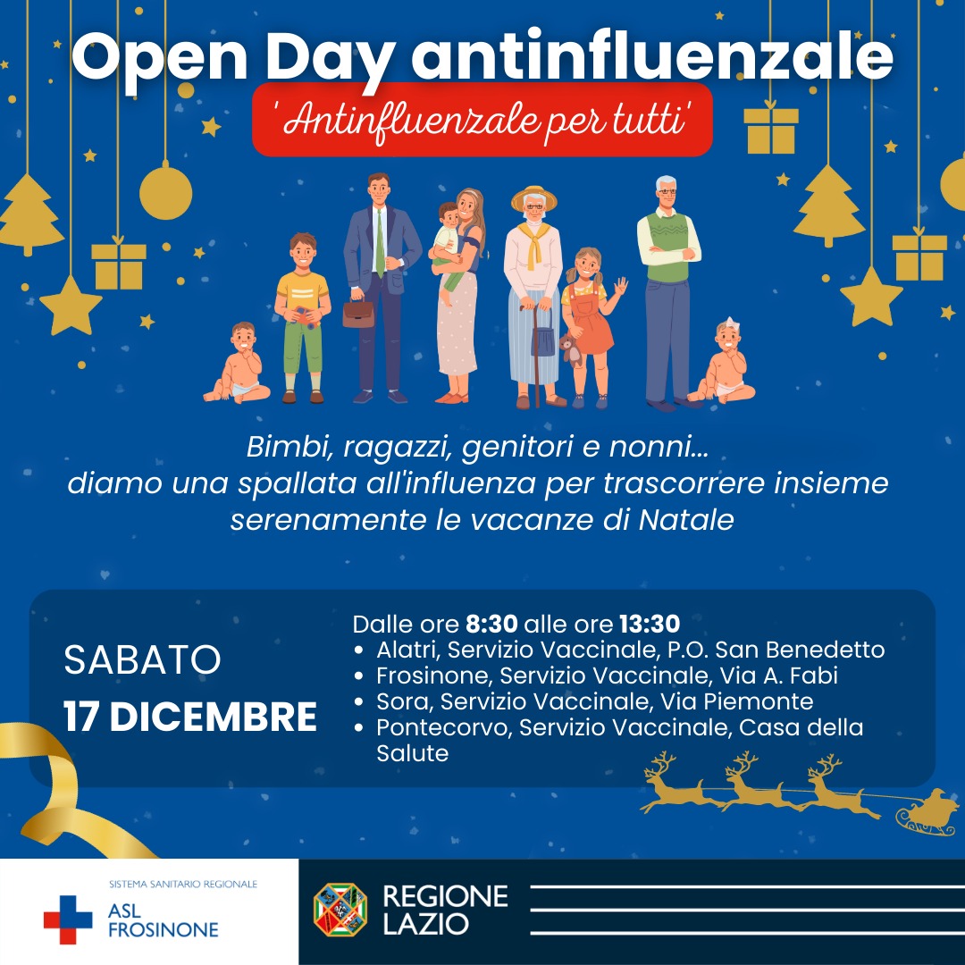 A ASL de Frosinone organizou, para sábado, 17 de dezembro, um Open Day com a oferta da vacina contra a gripe para avós, pais, adolescentes e crianças, abrindo quatro escritórios que cobrem todo o território provincial.