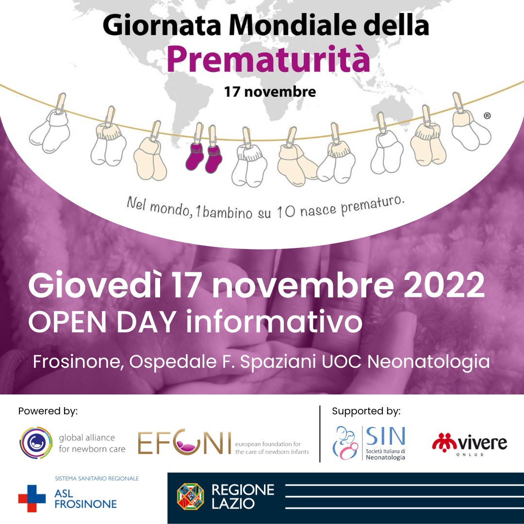 A UOC de Neonatologia do Hospital Fabrizio Spaziani em Frosinone apoia a iniciativa promovida pelo SIN – Sociedade Italiana de Neonatologia e celebra o Dia Mundial da Prematuridade, que se realiza todos os anos no dia 17 de novembro, com um Dia Aberto de Informação na Clínica de Neonatologia.