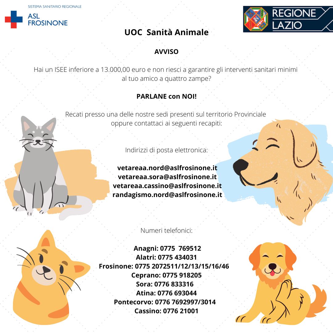 A ASL de Frosinone, com o Serviço Veterinário da Área de Saúde Animal, em linha com o que já foi feito na área da Odontologia Social, para oferecer ajuda concreta aos grupos mais fracos da sociedade, no âmbito do Plano de Prevenção 2022/2023, incluiu uma atividade de Veterinária Social para oferecer tratamentos básicos de saúde gratuitos, para cães e gatos próprios, a grupos populacionais com um ISEE inferior a 13.000 euros.